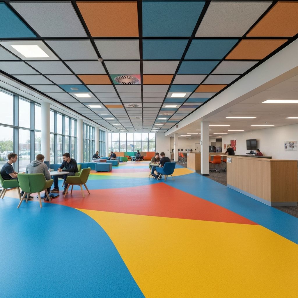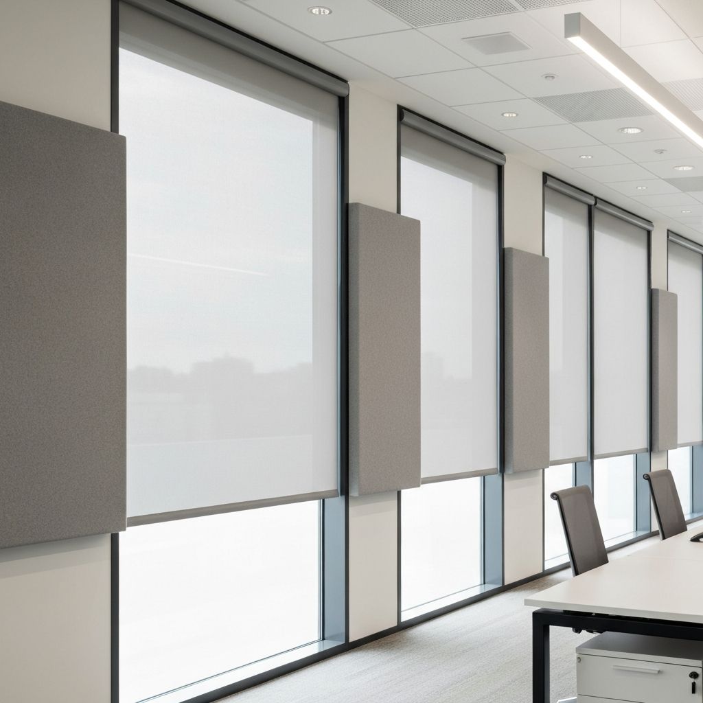 Piso vinílico, carpete, painéis acústicos e cortinas